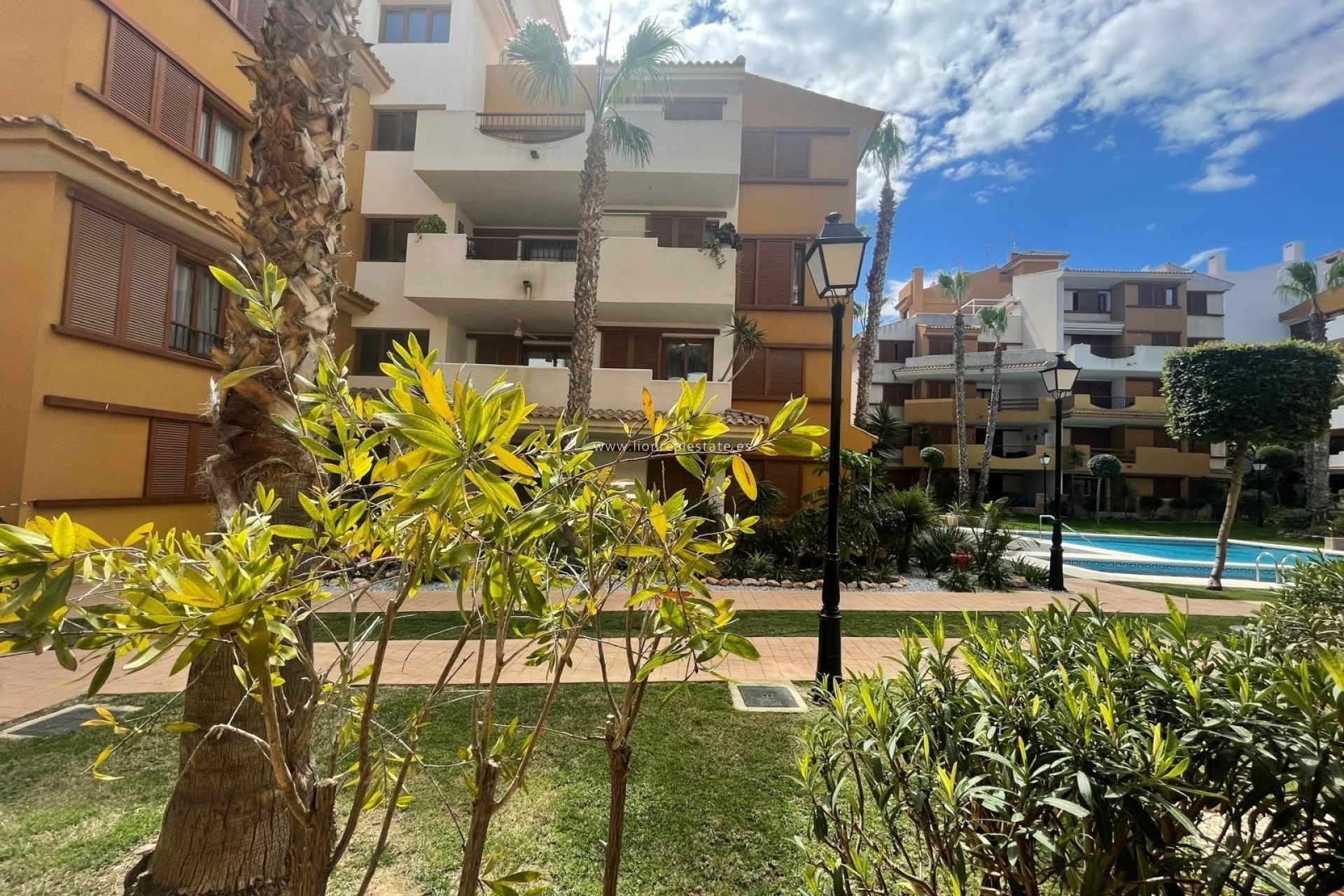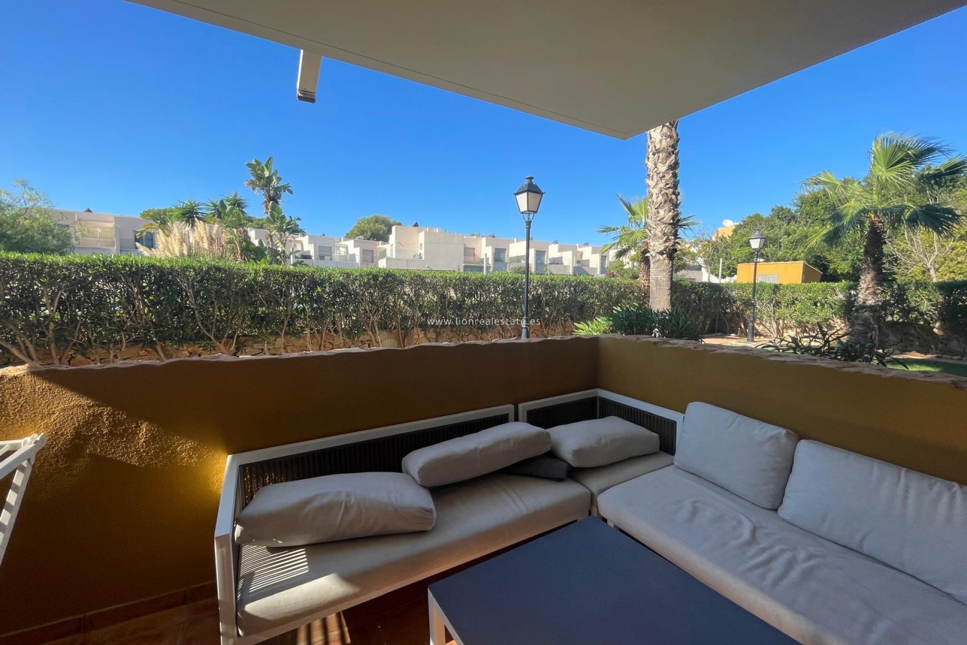 Se ofrece a la venta un acogedor y luminoso apartamento con dos dormitorios y dos baños, situado en la planta baja del reconocido complejo residencial La Recoleta, uno de los más demandados de la Costa Blanca.