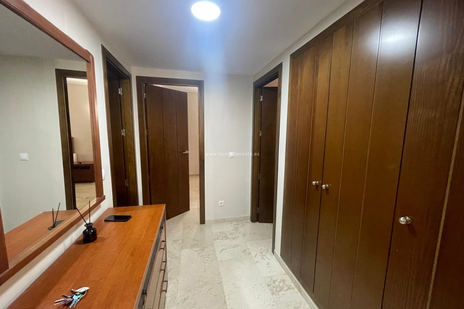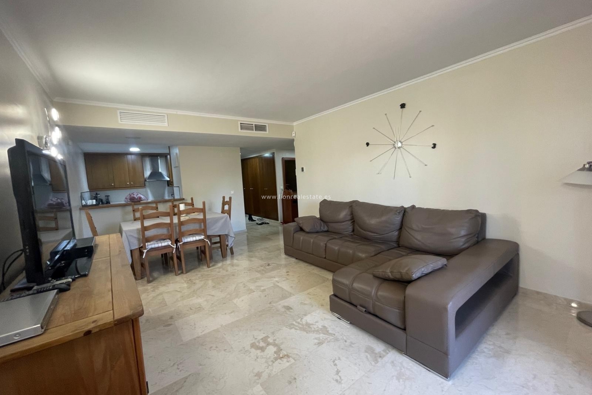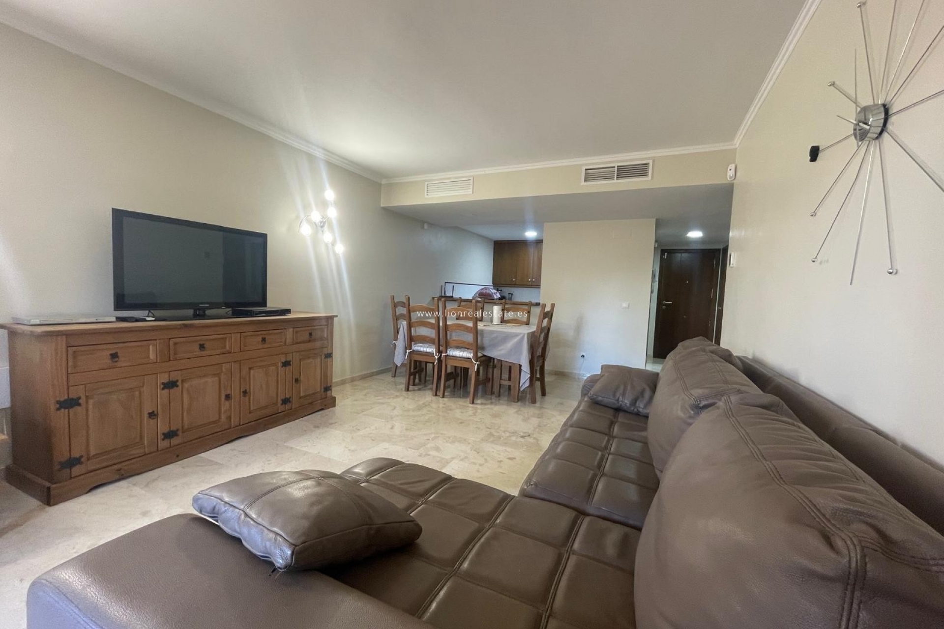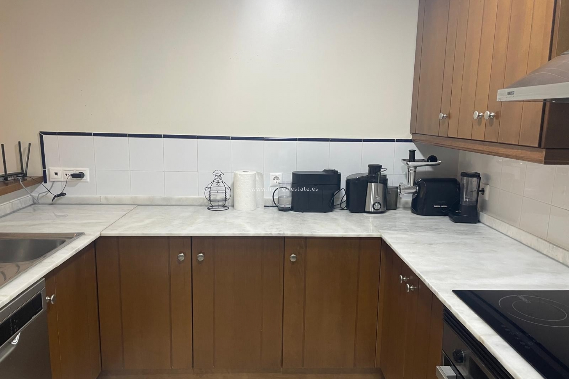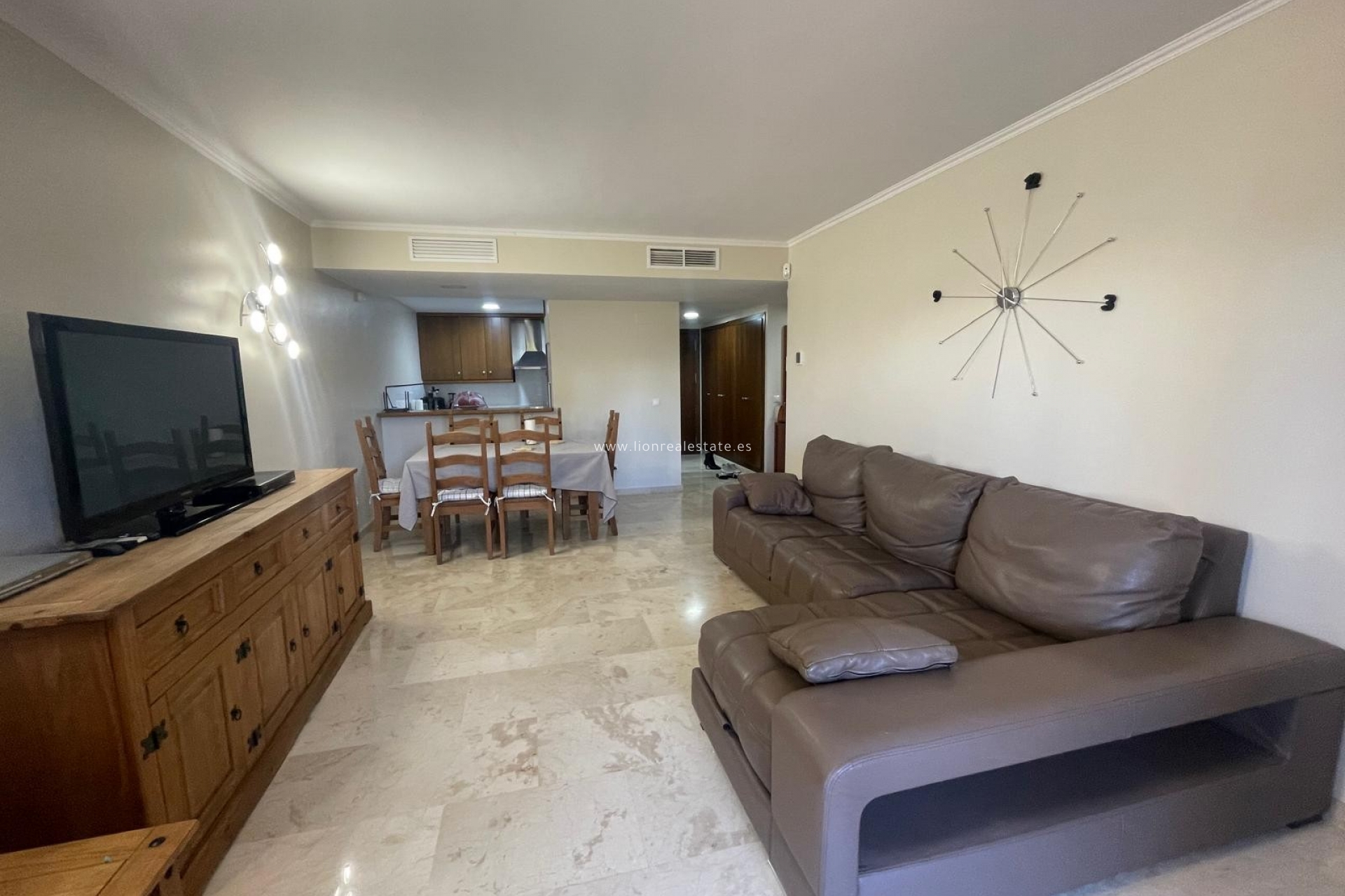 El apartamento está decorado en estilo español, completamente amueblado y listo para entrar a vivir. El amplio salón se combina con una cocina de concepto abierto, equipada con todos los electrodomésticos necesarios. Desde el salón se accede a una gran terraza con vistas a las zonas verdes del complejo, un lugar perfecto para disfrutar del sol y la brisa marina durante todo el año.