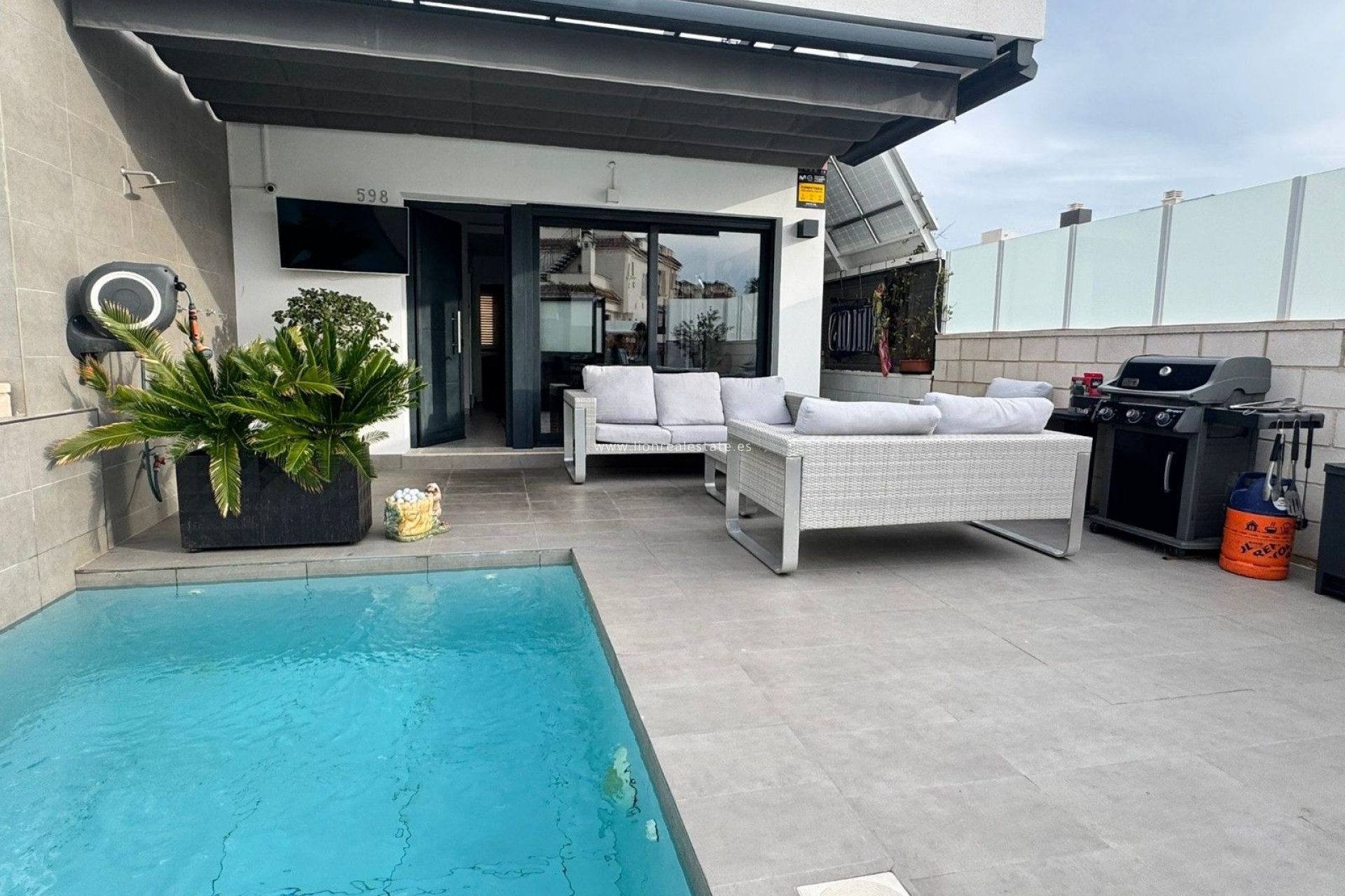 ~En la azotea se encuentra un solárium con ducha, zona de descanso y vistas despejadas, perfecto para disfrutar del clima mediterráneo durante todo el año. En la parcela hay una piscina privada con una acogedora zona de relax.