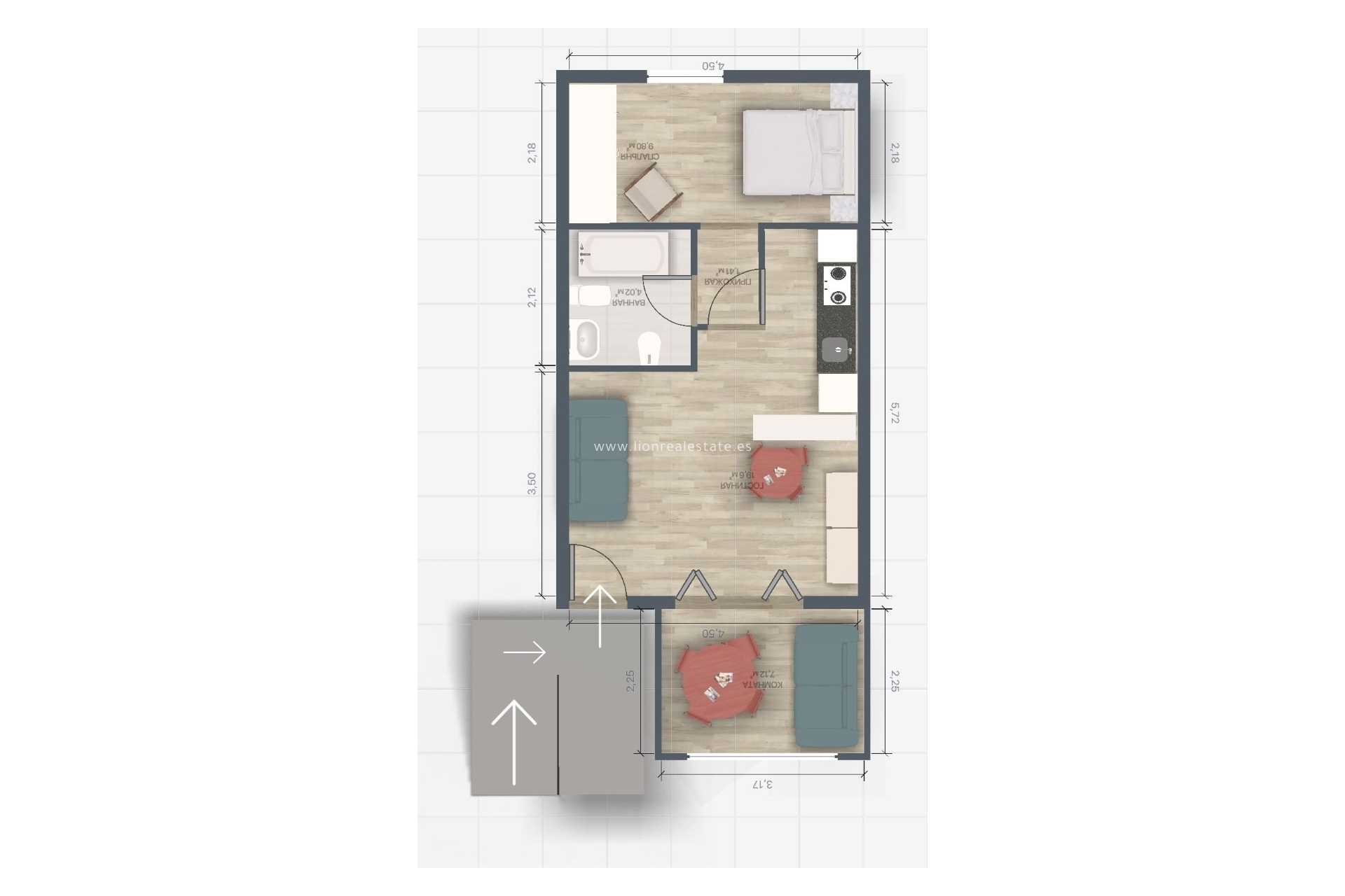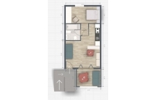 The layout includes a separate bedroom, a bathroom with a shower, and a bright living room with an open-plan kitchen.