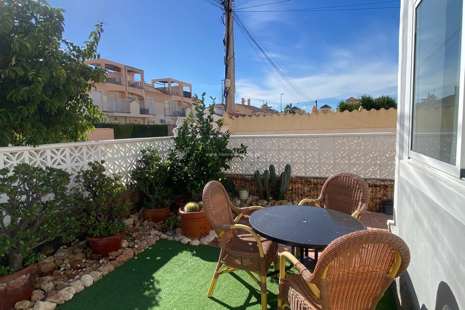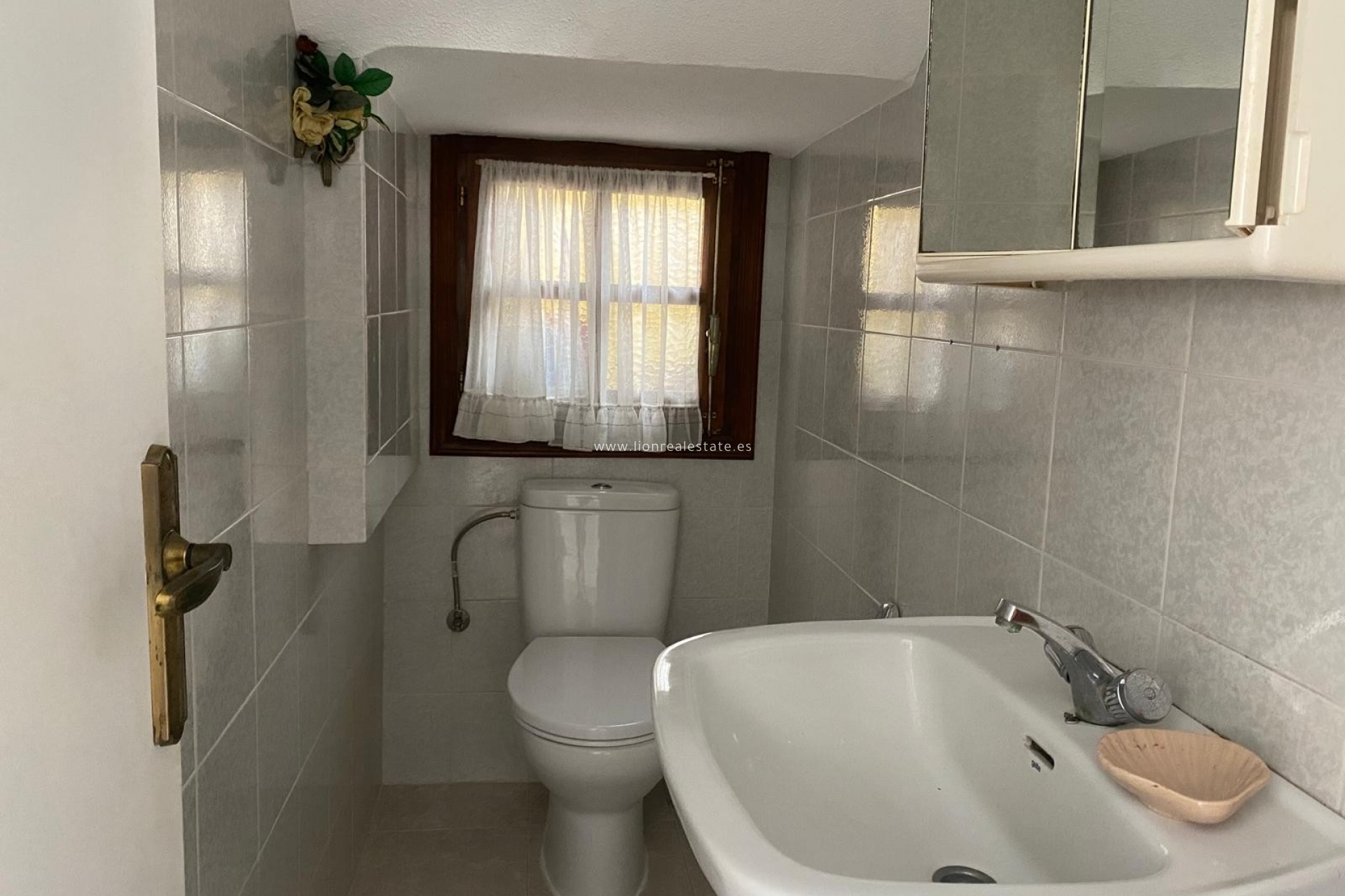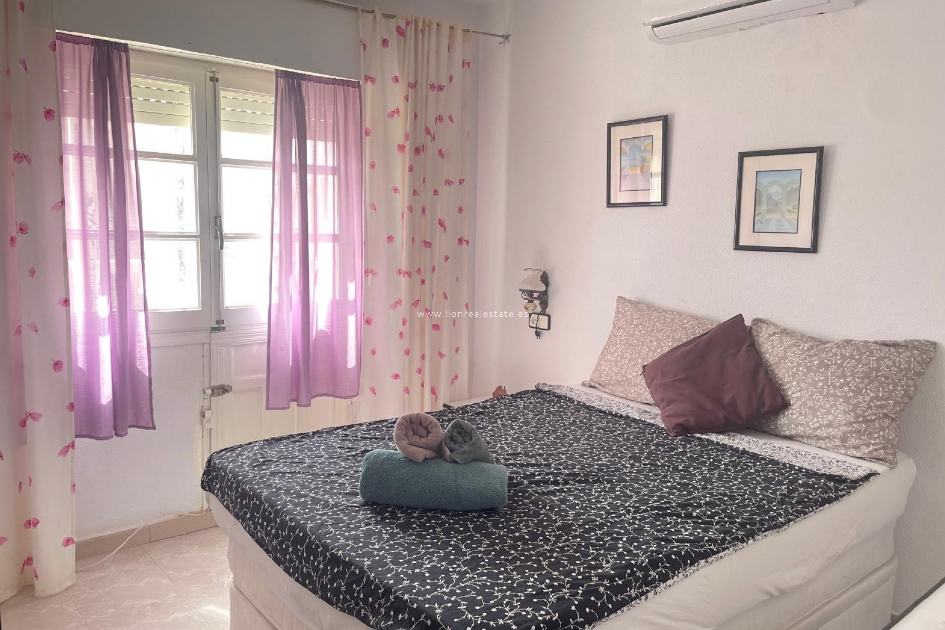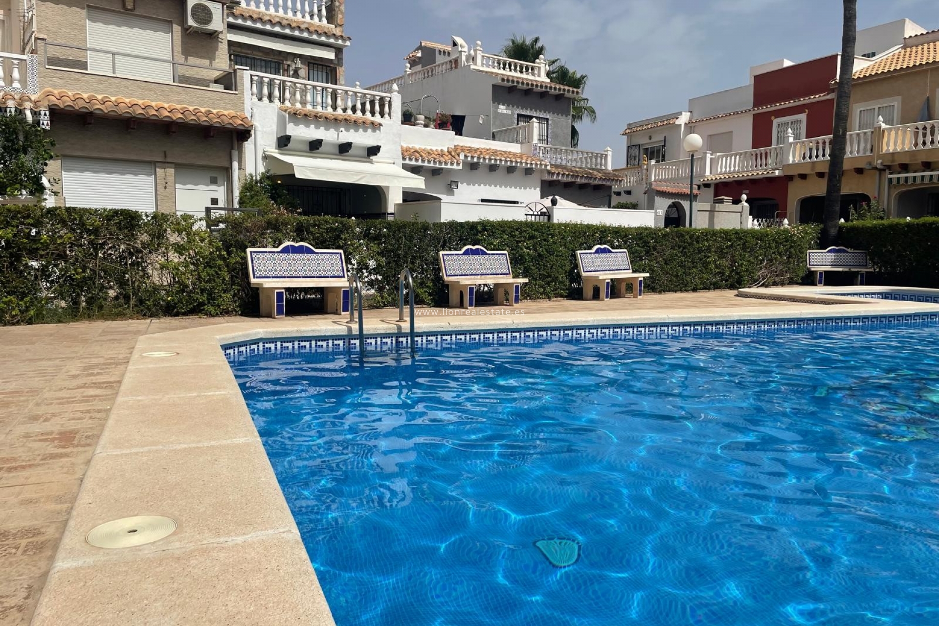 A cozy two-story corner townhouse with two bedrooms, one full bathroom, and a separate toilet is available for short-term rent. It is located in the residential area of Las Chismosas (Orihuela Costa, Alicante province). The house is semi-detached, with neighbors only on the right side, offering more privacy and tranquility. It is part of a quiet residential complex with a communal pool and green areas, ideal for family vacations.