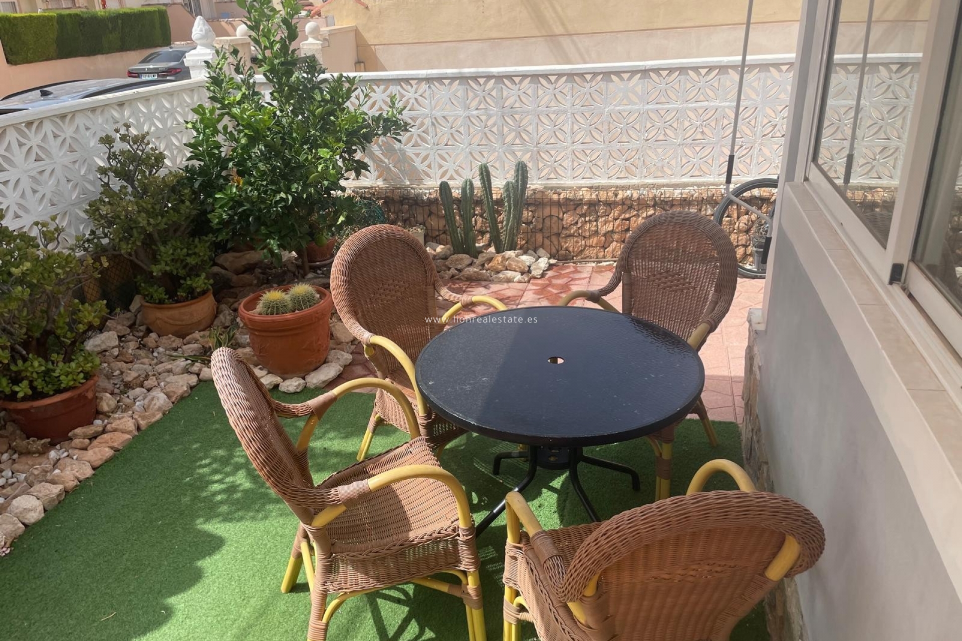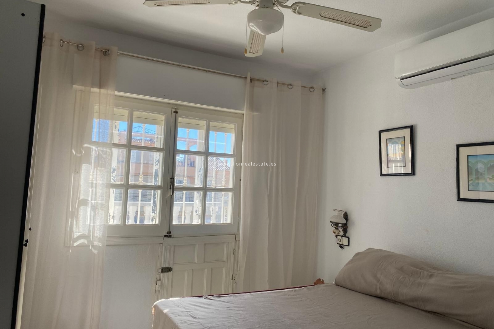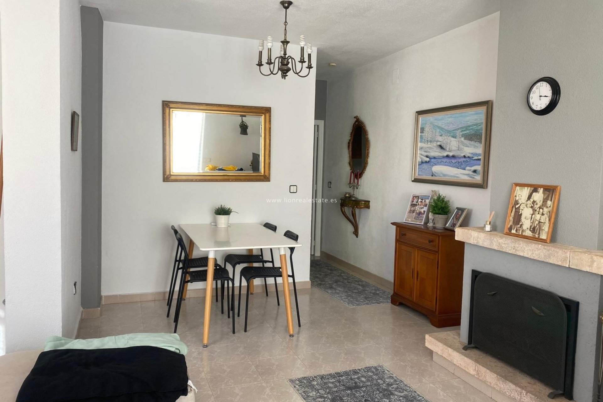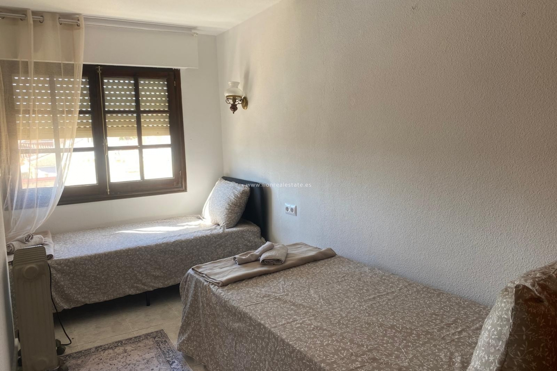 A cozy two-story corner townhouse with two bedrooms, one full bathroom, and a separate toilet is available for short-term rent. It is located in the residential area of Las Chismosas (Orihuela Costa, Alicante province). The house is semi-detached, with neighbors only on the right side, offering more privacy and tranquility. It is part of a quiet residential complex with a communal pool and green areas, ideal for family vacations.