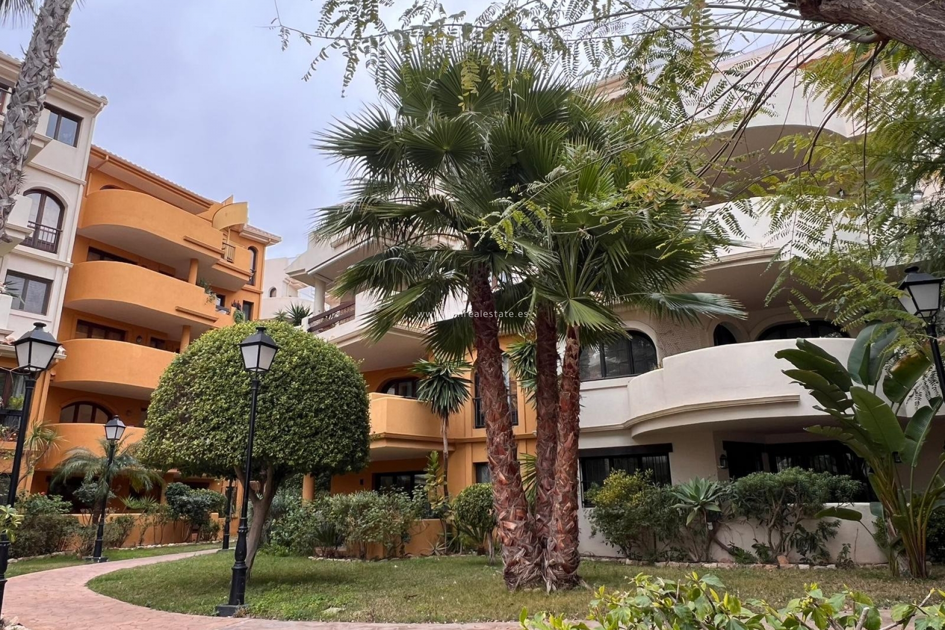 The complex is built in a distinctive Mediterranean style, offering well-maintained green areas, palm trees, decorative gardens, and several swimming pools for residents. The gated community provides 24-hour security, ensuring safety and peace of mind.